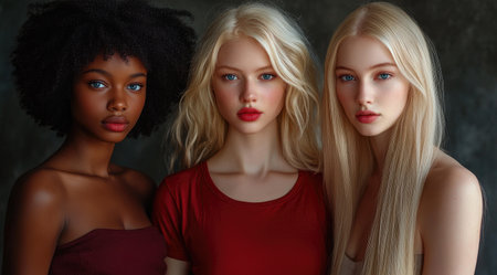 Three young women with afro hairstyle and red dress in studio