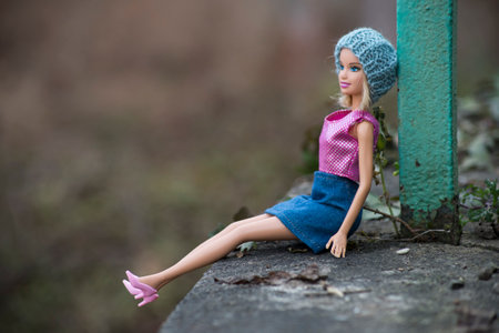 Mulhouse - France - 4 march 2021 - Portrait of Barbie doll with woolen hat, blue jeans skirt and a pink top sitting in the street
