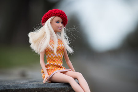Mulhouse - France - 13 March 2021 - Portrait of blond Barbie doll wearing orange summer dress and red woolen beret sitting in urban park