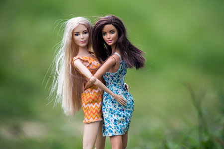 Mulhouse - France - 3 May 2021 - Portrait of two Barbie dolls wearing summer dresses standing in a meadow