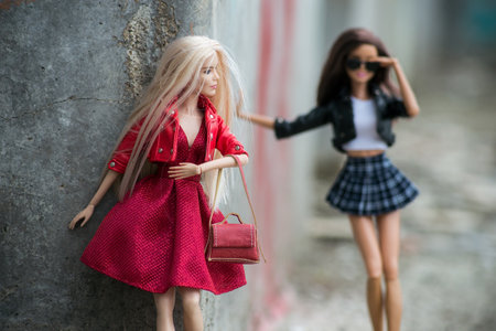 Mulhouse - France - 13 May 2021 - Portrait of two Barbie dolls wearing mini skirt, black leather jacket, red dress and sunglasses posing in the street