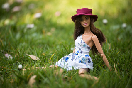 Mulhouse - France - 24 March 2022 - Portrait of brunette barbie doll wearing a blue dress sitting in the grass