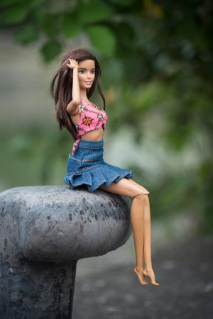 Mulhouse - France - 1 June 2022 - Portrait of brunette barbie doll wearing a blue jeans skirt and pink bra of bikini siting in border river
