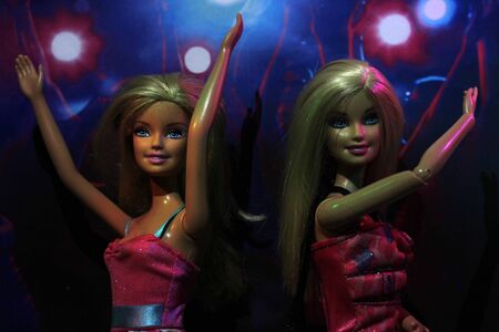 Mulhouse - France - 16 May 2021 - Portrait of two barbie dolls wearing mini skirts and leather jacket sitting on sofa in outdoor