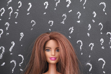 Tambov, Russian Federation - June 14, 2020 Portrait of Barbie doll with brown hair against blackboard with question marks.