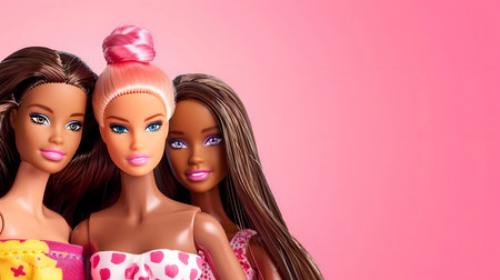 Three Barbie dolls with different hair color and features, looking at the camera with a joyful and cheerful expressions, against a pink background.
