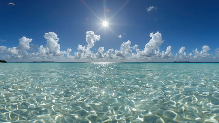 Crystal-clear turquoise ocean water reflecting sunlight under a bright sun. Fluffy white clouds and a vibrant blue sky create a serene tropical atmosphere.