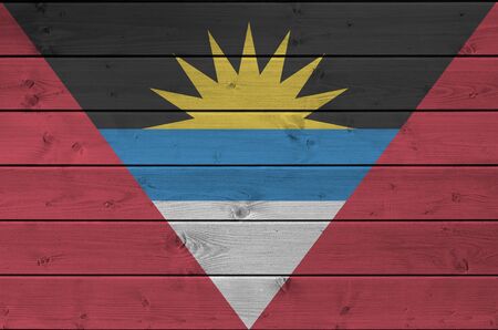 Antigua and Barbuda flag depicted in bright paint colors on old wooden wall close up. Textured banner on rough background