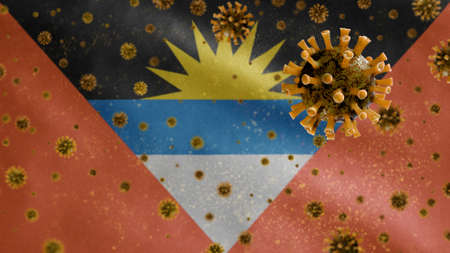 3D, Antiguan and Barbudan flag waving with Coronavirus outbreak infecting respiratory system as dangerous flu. Influenza type Covid 19 virus with national Antigua and Barbuda banner
