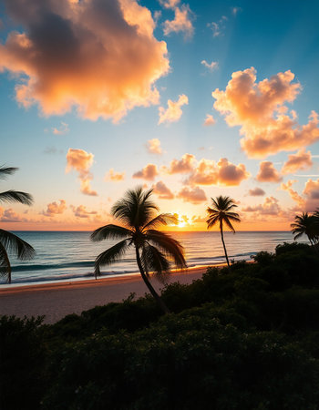 Sunset at the beach with palm trees and clouds in the sky
