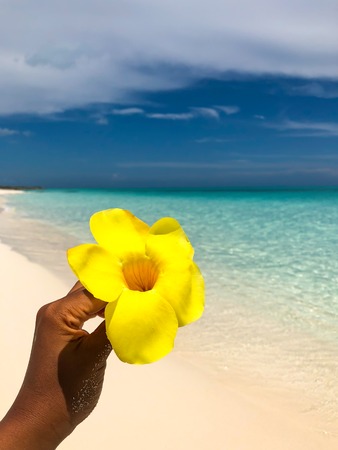 Yellow flower held in a female hand in front of a beautiful white sand beach, crystal clear water and blue sky in the background.