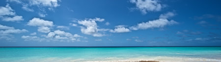 Panoramic view of caribbean beach with blue sky and white clouds