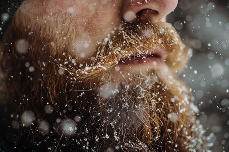 Closeup of a bearded mans face with snowflakes adorning his beard