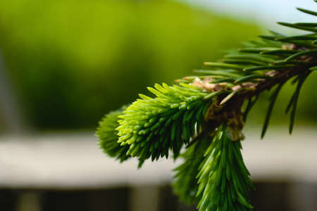 Spruce canadian Picea glauca Daisy's White. Conifers. Close up of young sprouts. Shallow depth of field. Selective focus.