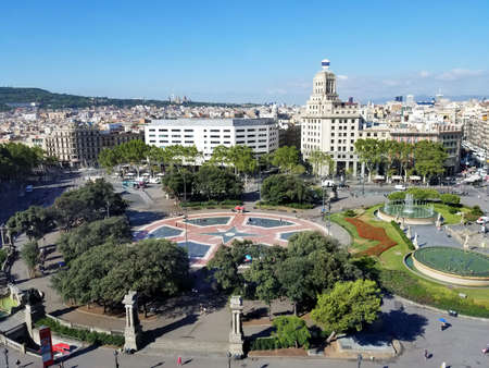 Plaza Catalunya in Barcelona, Spain. Panoramic view of Barcelona city center. Placa de catalunya