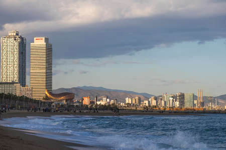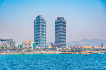 BARCELONA, SPAIN, JUNE 30, 2019: Twin towers standing over Barceloneta beach in Barcelona, Spain