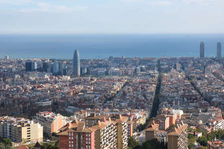 Barcelona, Spain - 5 November 2021: Barcelona city view with water on background, town aerial view, Illustrative Editorial.