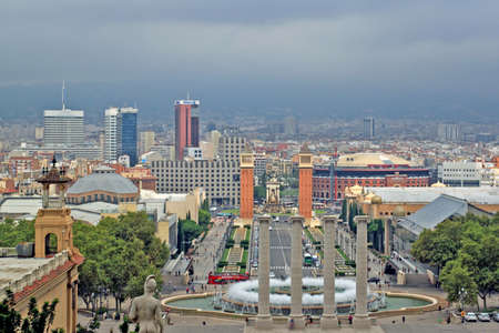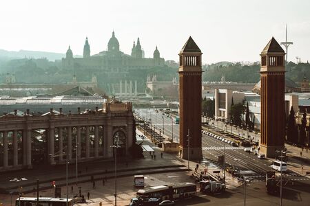 Barrcelona, Spane, June 2014: View of Plaza de Espana with Venetian towers in Barcelona. Barcelona seen from the terrace of the Catalan Art Museum, Spain
