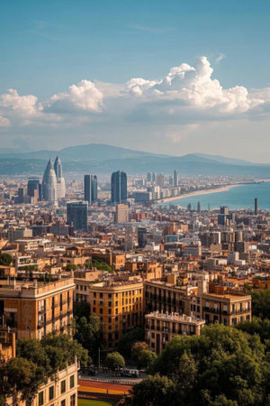 A stunning panoramic view of Barcelona showcasing the vibrant skyline, modern architecture, and clear blue sky. Ideal for travel and cityscape enthusiasts.