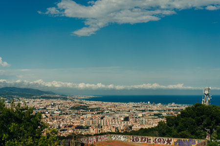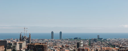 Barcelona, Spain - July 27, 2019: Beutiful panoramic view of Barcelona coastline and Mediterranean sea on a summer day, Catalonia, Spain