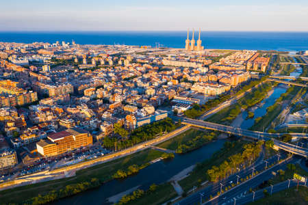 Aerial view of Badalona and Sant Adria de Besos on Besos river, Spain