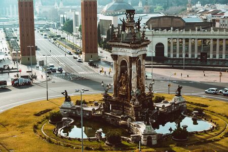 Barcelona, Spain. April 25, 2022. Aerial view of Placa d'Espanya, towards the Venetian Towers and the National Art Museum. This iconic square is located at the foot of Montjuic and it's a major landma