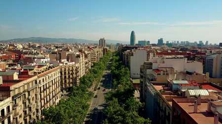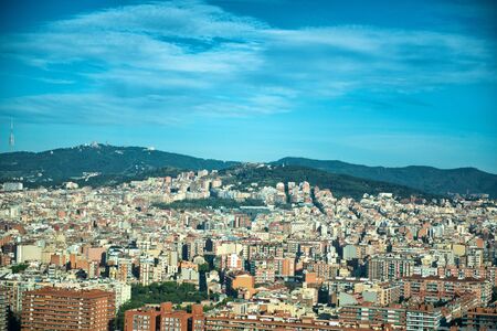 Barcelona, Spain - July 26, 2019: Aerial view of buildings and skyscrapers of Barcelona, Spain