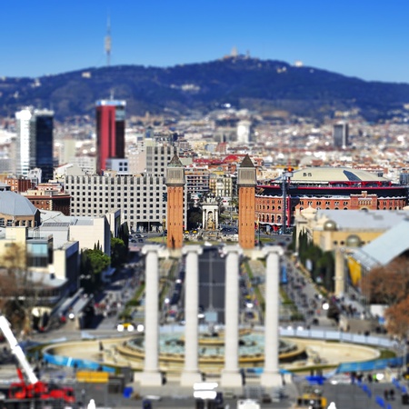 faked tilt shift of of placa de Espanya from Montjuich, in Barcelona, Spain