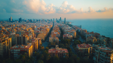 Stunning aerial view of Barcelona, Spain, showcasing the Sagrada Familia and a long avenue. The warm sunset light bathes the city in golden hues, highlighting the architecture and urban layout. The composition emphasizes symmetry and perspective.