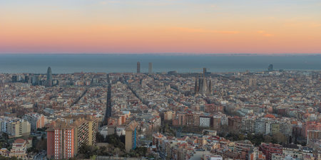 Above, afternoon, apartment, architecture, area, attraction, barcelona, before sunset, birds eye view, block, building, catalonia, catalunya, city, cityscape, cloud, dense, district, downtown, europe, european, evening, exterior, house , landmark, landscape, orange, outdoor, outside, panorama, panoramic, perspective, residential, roof, rooftops, scene, sky, skyline, skyscraper, spain, spanish, street, sunset, top, tourism, town, travel, twilight, urban , view