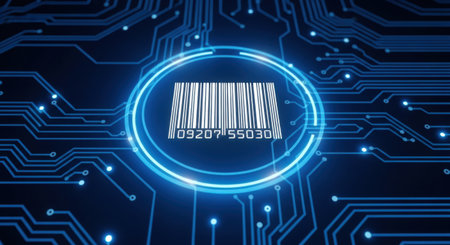 A glowing digital barcode is centrally featured on a complex, illuminated circuit board, representing technological innovation and data.