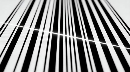 Intense high-contrast monochrome artwork with precise vertical stripes and sharp scanning light, conveying a modern, data-driven atmosphere. Ideal for tech graphics, digital interfaces, product packaging, and marketing in retail, logistics, and IT sectors. Versatile for contemporary branding, posters, and web designs by professional creatives. . AI-generated digital illustration. AI-generated illustration.