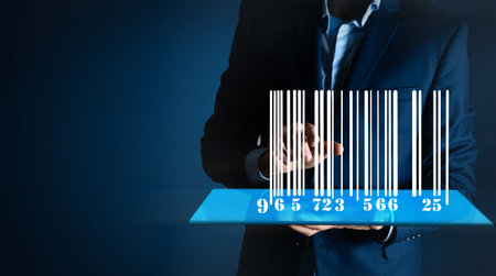 Bar code. Retail label barcode scan. Reader laser scanner for warehouse holding hand. Product code data concept