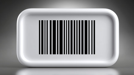 A tray holds a black barcode on a smooth white surface. This barcode shows numbers and lines that represent product information. It can be scanned for pricing and inventory tracking.