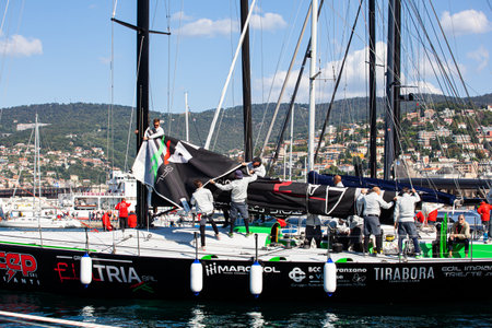 Trieste, Italy - October, 09: The crew of sailboat haul down the sails during the 53 ° Barcolana regatta in the Trieste sea on October 09, 2021