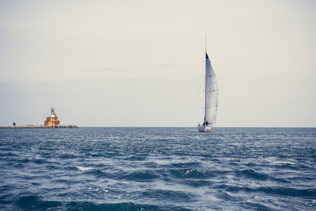 Sailing ship yacht with white sail in the open sea heading to neapolis coast