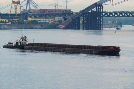 A river tug pushes a barge in the water area of the Dnieper.