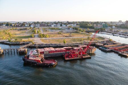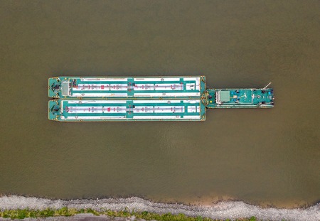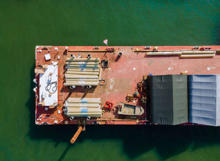 Aerial view of Barge or offshore vessel with cargo on the river. Cargo ship on the river.