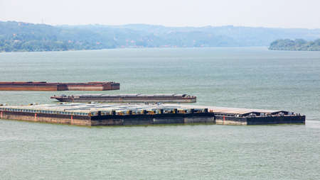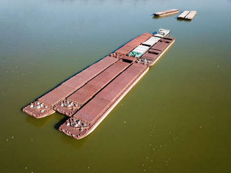 A river barge on the Ohio River with loads of coal, scrap metal and iron and more on a sunny day