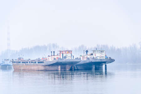 Tankers on the Danube River during the winter period. Anchored tankers on the Danube River in winter.