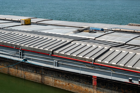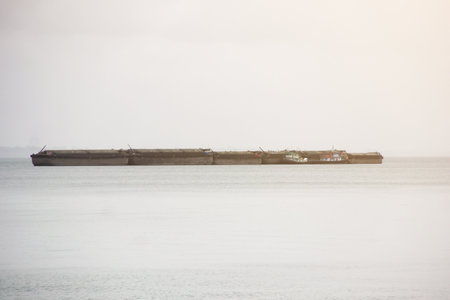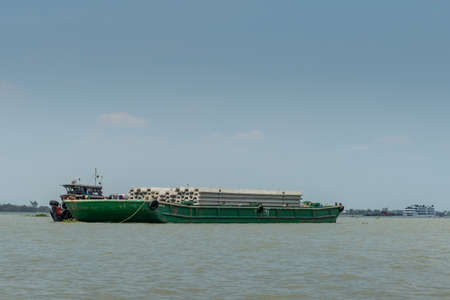 Tan Phong, Mekong Delta, Vietnam - March 13, 2019: Large green pontoon filled with gray large concrete beams. Tugboat along under blue sky, brown-greenish water. Cruise ship on horizon.