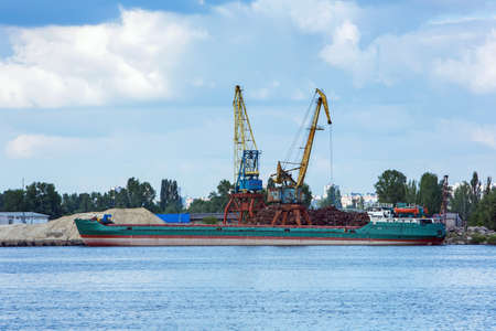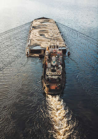 Cargo ship barge loaded with sand on the river