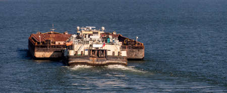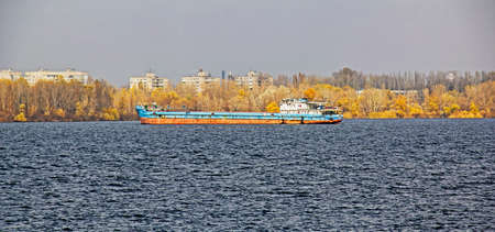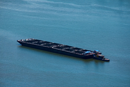 barge transports cargo on the river. Selective focus