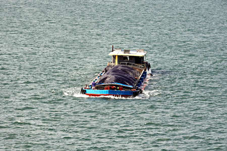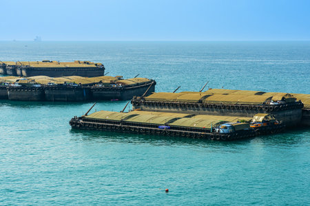Seagoing vessels, barges, tugboats and small boats at the roadstead of Halong bay under cargo operations and underway. Port of Campha, China. Vietnam, October, 2020