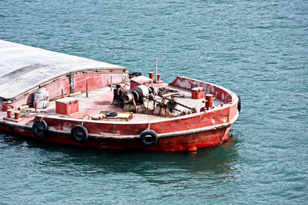 Close-up views of equipments, constructions of vessel, barges, tugboats and small boats at the roadstead of Halong bay. Port of Campha, Vietnam, October, 2020