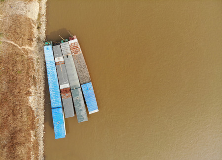 top view of drone camera of Laos transportation boats parking at golden triangle port of Chiang saen,Chiang rai,Thailand