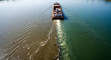 An aerial view of a large cargo barge traveling on a river, leaving a dirty wake filled with trash and pollution, which contrasts sharply with the cleaner water. The image is a stark representation of water pollution and its environmental impact.