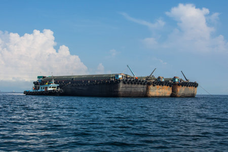 Large cargo barge in sea. Large tugboat anchored to avoid monsoon storm at back of island. Tugboat cargo carry products. Importance of river transport in transporting goods and developing economy.