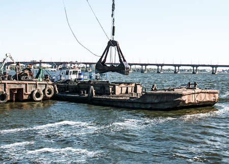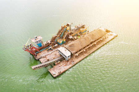 Extraction of sand from the river, excavator digs out sand from the bottom of the lake and unloads it on a floating barge, mining