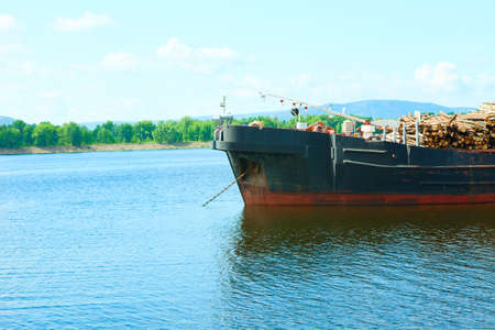ship at anchor in the summer the river loaded with logs
